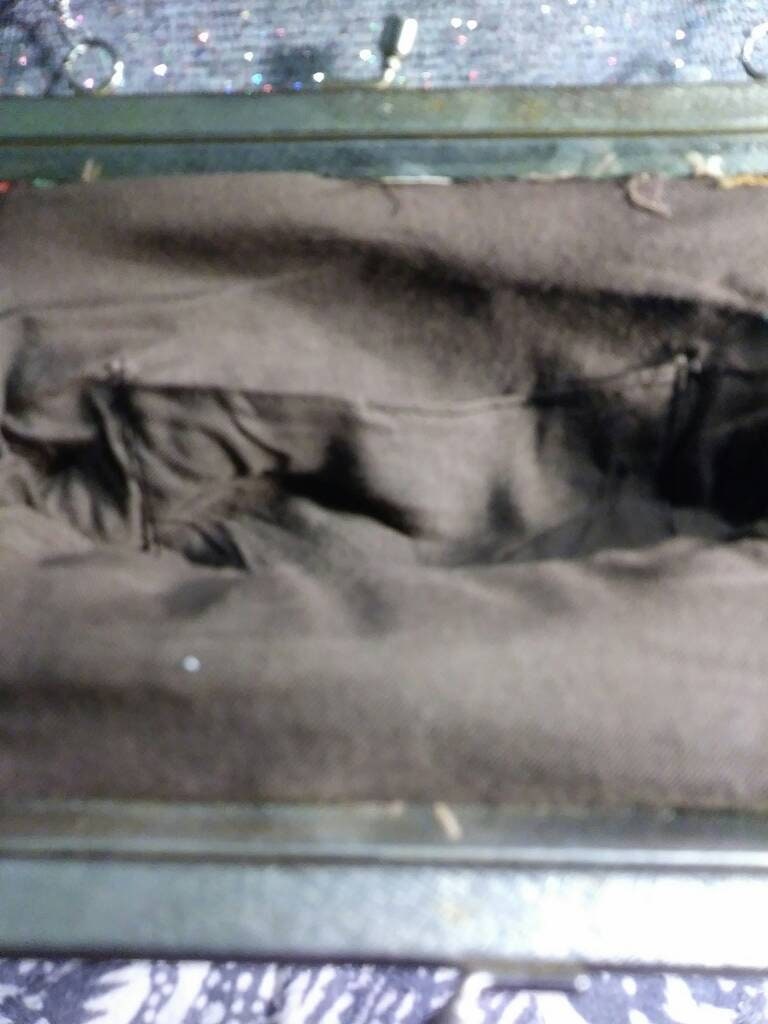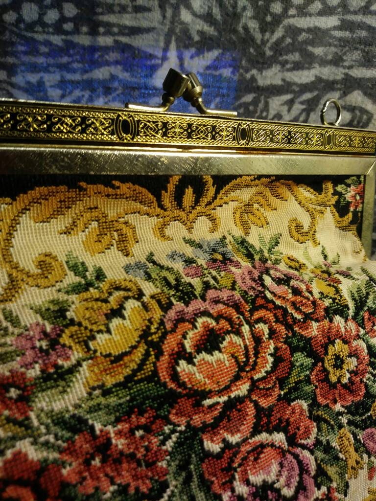 This Vintage 60 Tapestry bag has the tapestry on both sides. It measures 6" high and 6.5" wide. The handle which is a chain is 16" long the top edge of the kiss closure has a nice little art deco design. The colours in the tapestry are very pretty it looks like peonies with daffodils. The interior of the bag is black cotton cloth, with one side pocket. The bag is very clean inside and out. Very nice condition. Age and play wear the gold tone has faded for the kiss closure and I do not believe the chain is original. This would make a great gift for someone special, including yourself.