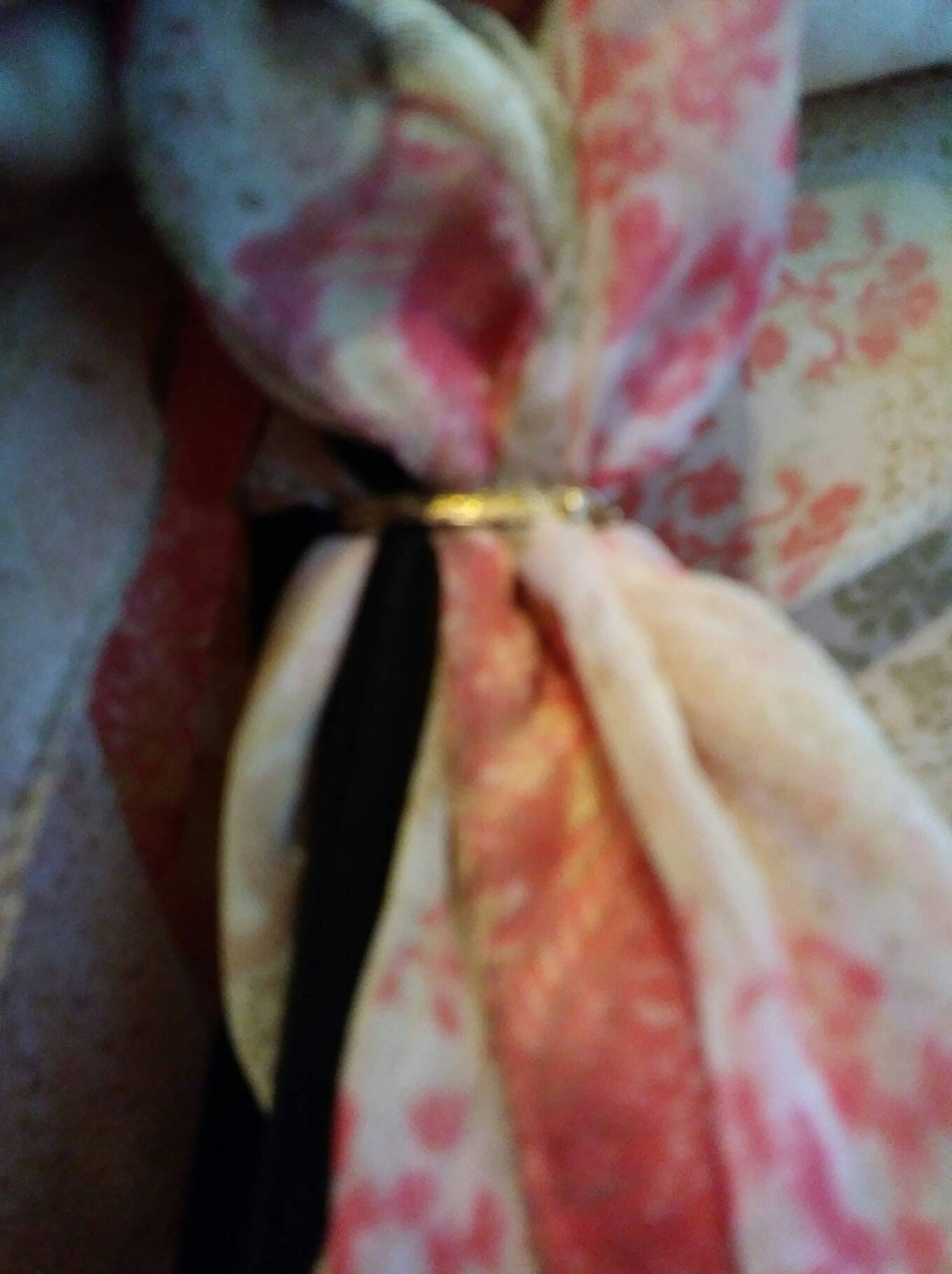 This is a nice size scarf clip that will keep a sheer shawl or scarf in place, when creating your own terrific style. The clip can go around a sleeveless dress and the sheer shawl or scarf to hold it in place. I have some photos showing the back and front of the clip and also being used. The clip measures 1.75" by 1.25" it has a depth of 1". The closure is a safety style clip. It is gold tone and has minimal age wear. A barely noticeable very slight ding but all the colour is in tact. Overall very good condition.